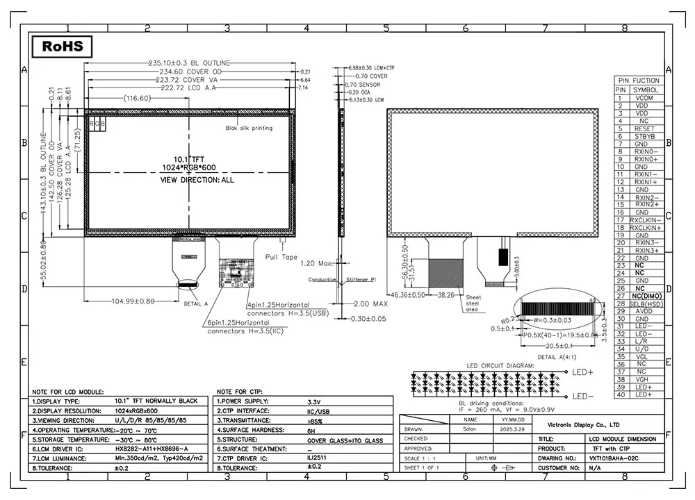 Στην εποχή της νοημοσύνης, η μονάδα TFT μας επιτρέπει να παρουσιάσουμε οπτικά τα απαιτούμενα δεδομένα. Η ποιότητα της μονάδας TFT έχει κρίσιμο αντίκτυπο στην εφαρμογή της. Ποια είναι τα πλεονεκτήματα του Victronix 10,1 ίντσας 1024 × 600 LVDS TFT Module με CTP; Αρχικά, η φωτεινότητα 420 CD/m², η αναλογία αντίθεσης 800: 1, η γωνία προβολής 80 μοιρών προς όλες οι κατευθύνσεις και η ομοιομορφία 75% εξασφαλίζουν ζωντανές εικόνες. Δεύτερον, υποστηρίζει μια διασύνδεση LVDS 6/8-bit με τον ελεγκτή HX8282A11+HX8696A και έναν ισχυρό χωρητικό πάνελ 5 σημείων με τον ελεγκτή CTP ILI2511. Επιπλέον, διαθέτει λευκό οπίσθιο φωτισμό 3 × 13 με διάρκεια ζωής 30.000 έως 50.000 ωρών, εξασφαλίζοντας τη μακροπρόθεσμη χρηστικότητα του σε διάφορες βιομηχανικές εφαρμογές. Επιπλέον, συμμορφώνεται με τα πρότυπα ROHS και περνά επιτυχώς τις αυστηρές δοκιμές αξιοπιστίας, συμπεριλαμβανομένης της θερμικής σοκ, της υγρασίας και της προστασίας ESD έως και 8kv αέρα και επαφής 4KV. Το προϊόν αυτό λειτουργεί αποτελεσματικά σε ακραίες θερμοκρασίες που κυμαίνονται από -20 ° C έως +70 ° C και μπορεί να αντέξει σε σοβαρές συνθήκες αποθήκευσης από -30 ° C έως +80 ° C.