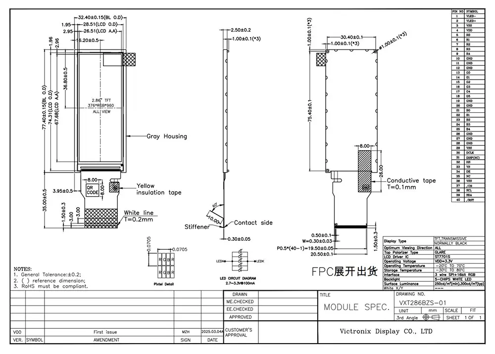 Στην εποχή της νοημοσύνης, η μονάδα TFT μας επιτρέπει να παρουσιάσουμε οπτικά τα απαιτούμενα δεδομένα. Η ποιότητα της μονάδας TFT έχει κρίσιμο αντίκτυπο στην εφαρμογή της. Ποια είναι τα πλεονεκτήματα της Victronix 2.86 ιντσών 376 × 960 IPS TFT Module; Αρχικά, η φωτεινότητα 300 CD/M², η αναλογία αντίθεσης 1500: 1, η γωνία προβολής 85 μοιρών προς όλες οι κατευθύνσεις και η ομοιομορφία 80% εξασφαλίζουν ζωντανές εικόνες. Δεύτερον, υποστηρίζει μια διασύνδεση RGB SPI+16bit με ST7701S και έναν οπίσθιο φωτισμό LED 5 DIE με διάρκεια ζωής 30.000 έως 50.000 ωρών, εξασφαλίζοντας τη μακροπρόθεσμη χρηστικότητα του σε διάφορες βιομηχανικές εφαρμογές. Εκτός αυτού, συμμορφώνεται με τα πρότυπα ROHS και περνά επιτυχώς τις αυστηρές δοκιμές αξιοπιστίας, συμπεριλαμβανομένης της θερμικής σοκ, της υγρασίας και της προστασίας ESD έως και 8kv αέρα και επαφής 4KV. Το προϊόν αυτό λειτουργεί αποτελεσματικά σε ακραίες θερμοκρασίες που κυμαίνονται από -20 ° C έως +70 ° C και μπορεί να αντέξει σε σοβαρές συνθήκες αποθήκευσης από -30 ° C έως +80 ° C.