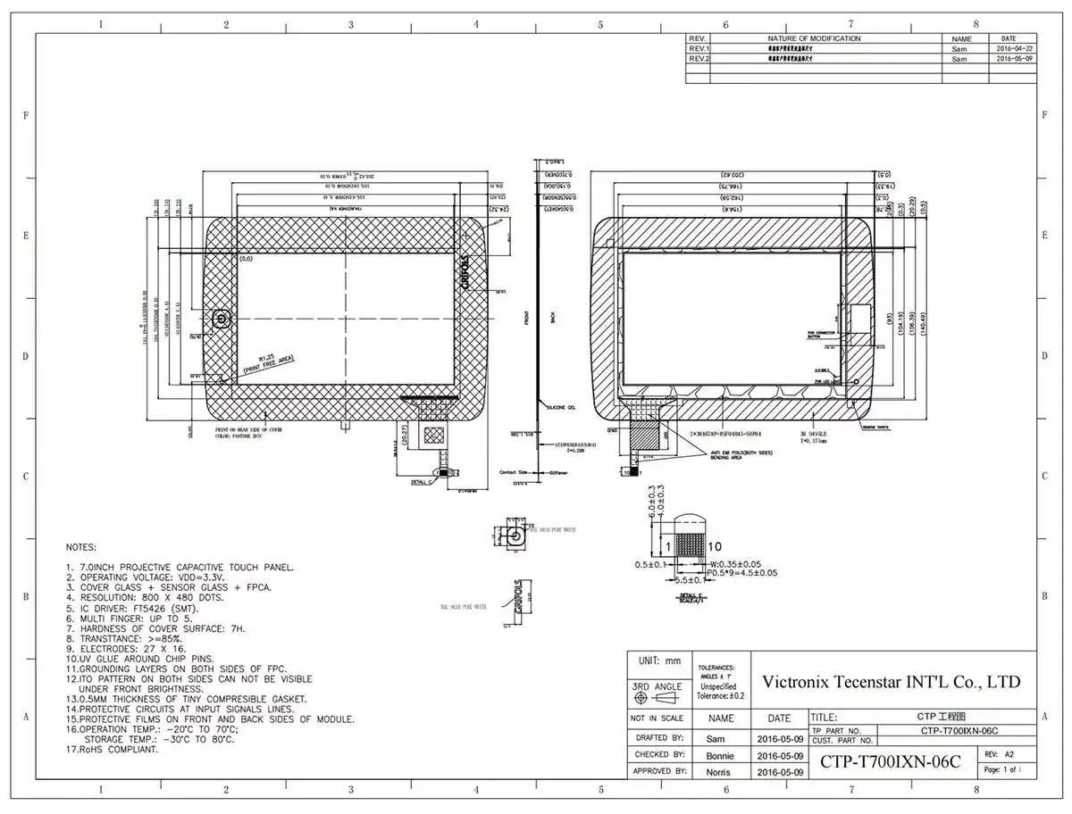 7 ιντσών Module TFT ως κοινό μέγεθος, ποια είναι τα ανταγωνιστικά πλεονεκτήματα της οθόνης αφής Victronix 7,0 ιντσών; Αρχικά, ο ενσωματωμένος ελεγκτής FT5426DQ8 εξασφαλίζει την ευαισθητοποίηση και την ακριβή ανίχνευση αφής μέσω της διεπαφής I2C και υποστηρίζει την πραγματική αλληλεπίδραση πολλαπλών επιπέδων 5 σημείων. Δεύτερον, η μετάδοση υψηλού φωτός (≥85%) στην περιοχή προβολής (154,6 x 91 mm) και ανθεκτική σε γρατζουνιές επιφανειακή σκληρότητα ≥7h παρέχει στους πελάτες εξαιρετική σαφήνεια και ανθεκτικότητα. Επιπλέον, είναι χτισμένο με 0,7mm σκληρυμένο κάλυμμα από γυαλί (LOCA) σε έναν αισθητήρα γυαλιού 0,55mm ITO. Περιλαμβάνει ένα ανθεκτικό σύνδεσμο ZIF FPC (μέγιστο πάχος: 1,5mm). Η προβλεπόμενη οθόνη αφής Victronix 7,0 ιντσών δοκιμάστηκε αυστηρά για να αντέξει τις ακραίες συνθήκες και τη θερμοκρασία αποθήκευσης από -30 ° C έως +80 ° C. Αυτή η οθόνη αφής Victronix 7Inch είναι κατάλληλη για τους πίνακες βιομηχανικών ελέγχων, τις ιατρικές συσκευές, τα περίπτερα, τα όργανα και οποιαδήποτε εφαρμογή που απαιτεί αξιόπιστη διεπαφή αφής υψηλής περιεκτικότητας σε προκλητικά περιβάλλοντα.