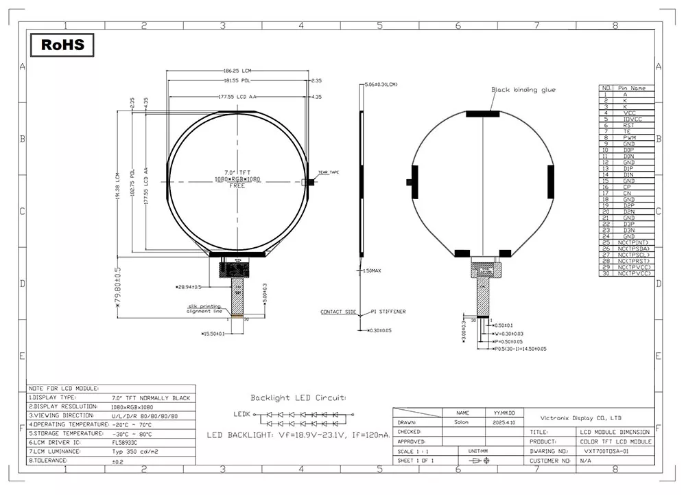 Η μονάδα TFT μπορεί να βρεθεί παντού στη ζωή. Τι κάνει αυτό το Victronix 7 ιντσών 1080 × 1080 στρογγυλό IPS TFT LCD διαφορετικό από άλλους κατασκευαστές; Αρχικά, η φωτεινότητα των 500 CD/m², η αναλογία αντίθεσης 800: 1 και η προβολή γωνιών 80 ° προς όλες τις κατευθύνσεις εξασφαλίζουν ζωντανές εικόνες. Δεύτερον, η συσκευή υποστηρίζει μια διεπαφή MIPI 4 λωρίδων με τον ελεγκτή FL5893DC για μεταφορά δεδομένων υψηλής ταχύτητας. Επιπλέον, διαθέτει 32 λευκό οπίσθιο φωτισμό LED με διάρκεια ζωής 30.000 έως 50.000 ωρών, εξασφαλίζοντας αξιόπιστες επιδόσεις σε διάφορες βιομηχανικές εφαρμογές. Εκτός αυτού, πληροί τα πρότυπα ROHS και περνάει αυστηρές δοκιμές αξιοπιστίας (θερμικό σοκ, υγρασία, αποθήκευση) για να λειτουργήσει άψογα σε ακραίες θερμοκρασίες (-20 ° C έως +70 ° C) και αντέχει σε σκληρές συνθήκες αποθήκευσης (-30 ° C έως +80 ° C).