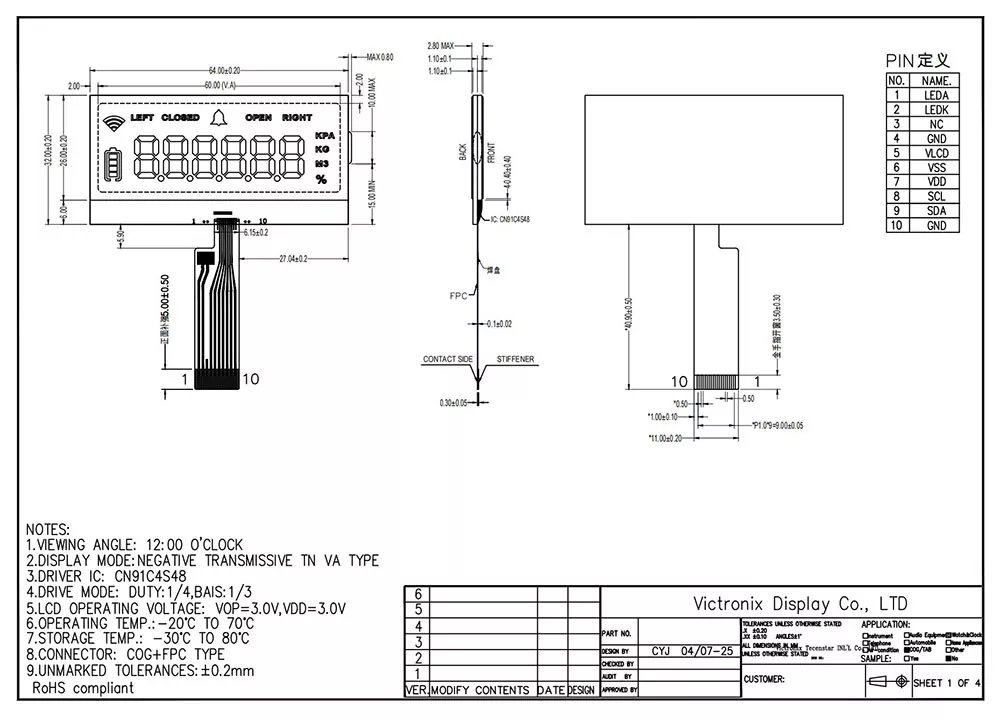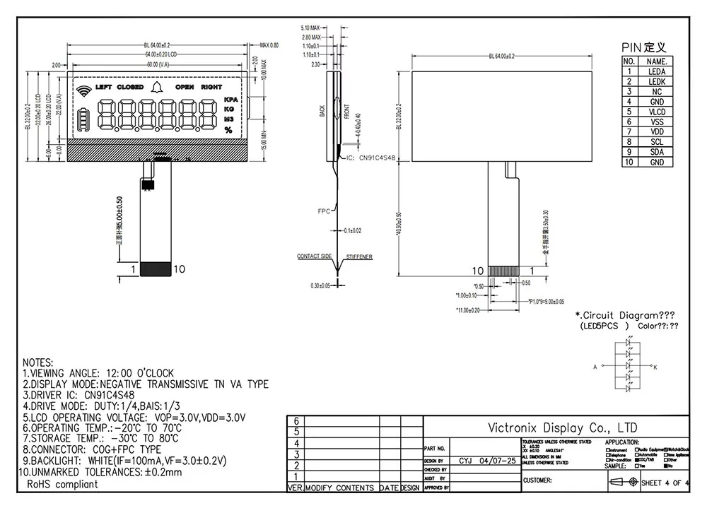 Αυτή η μονάδα LCD VA50472 VA Degment είναι ιδιαίτερα θεωρημένη στις ιαπωνικές αγορές, τι κάνει τα προϊόντα μας διαφορετικά από άλλους κατασκευαστές; Καταρχάς, διαθέτει αρνητική μεταδοτική οθόνη με βέλτιστη κατεύθυνση προβολής 12 η ώρα και ένα λευκό σύστημα οπίσθιου φωτισμού LED (VF = 3.0V, αν = 60mA). Δεύτερον, επικυρώθηκε μέσω λειτουργίας υψηλής θερμοκρασίας 96 ωρών (70 ° C)/χαμηλής θερμοκρασίας (-20 ° C), αντίστασης υγρασίας 90%RH και δοκιμών κραδασμών 10-55Hz για να λειτουργούν αξιόπιστα από -20 ° C έως +70 ° C. Εκτός αυτού, χρησιμοποιεί CN91C4S48 Driver IC και COG+FPC Type Connector. Επιπλέον, η περιοχή εμφάνισης είναι 60 × 24 mm και η διάσταση του περιγράμματος είναι 64 × 2,8 × 32 mm (εξαίρεση FPC).